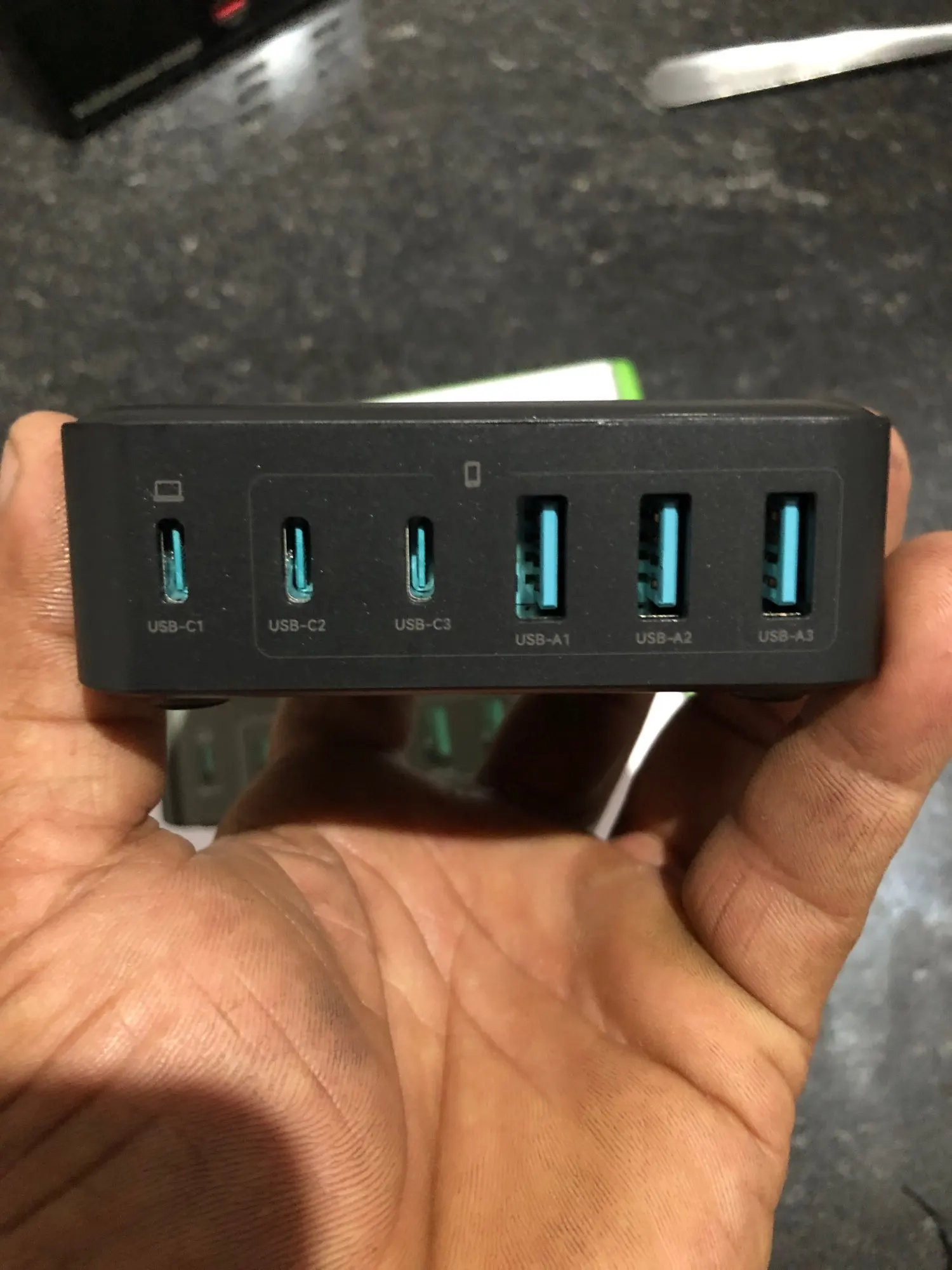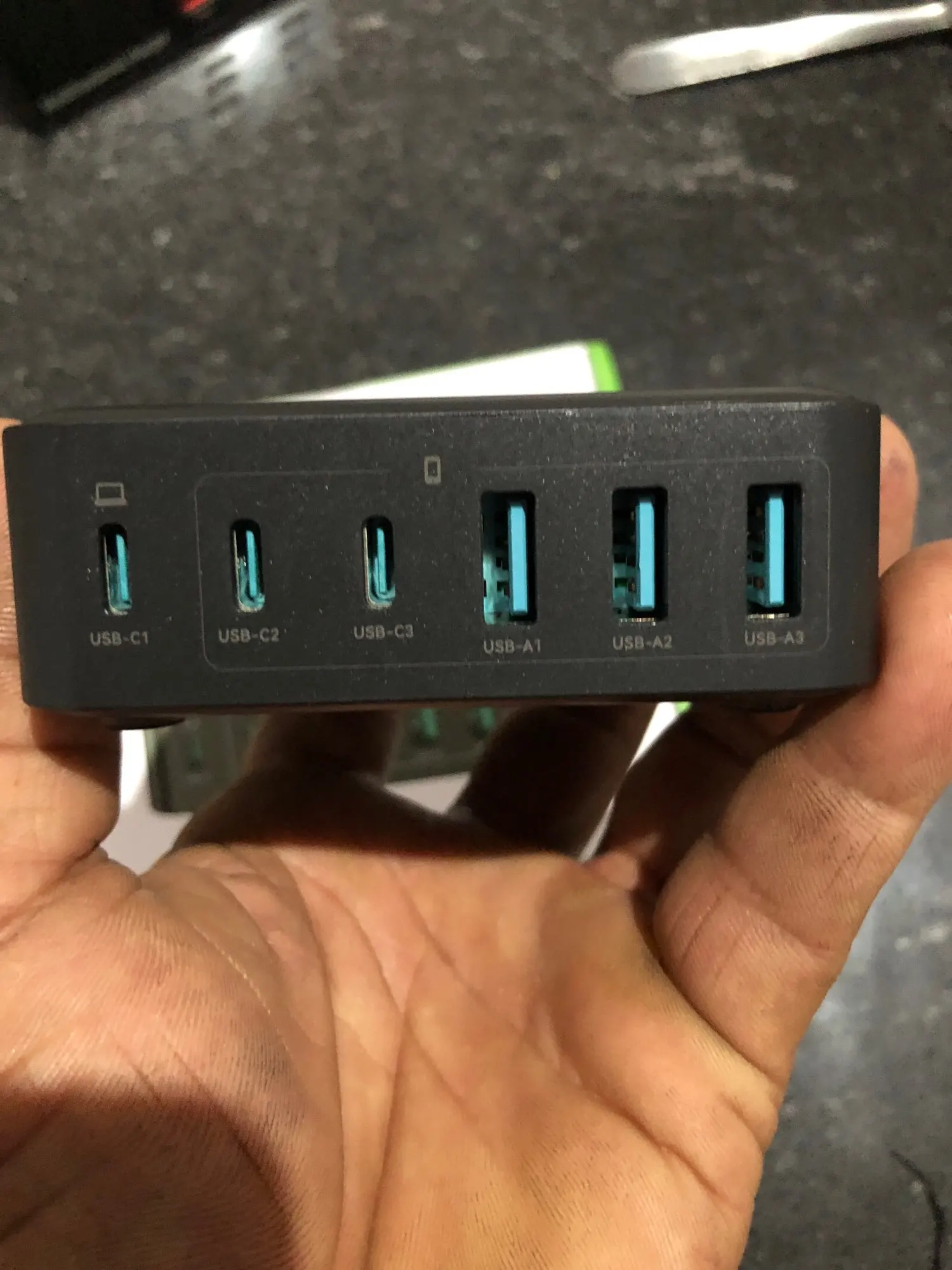 USB-C1+USB-C2+USB-C3+USB-A1+USB-A2+USB-A3 Total output: 65W+30W+20W+15W+15W+15W